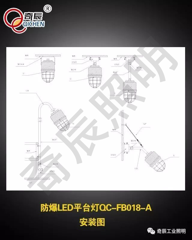 奇辰防爆LED平台灯QC-FB018-A外壳采用无铜铝合金压铸成型,表面高温静电喷塑,具有优良的防腐性能。各接合面均进行相应的密封处理,确保产品良好的防水、防尘、防腐、防电燃性能。灯具可采用吊杆、弯杆、支架等多种安装方式,方便现场安装和维护。